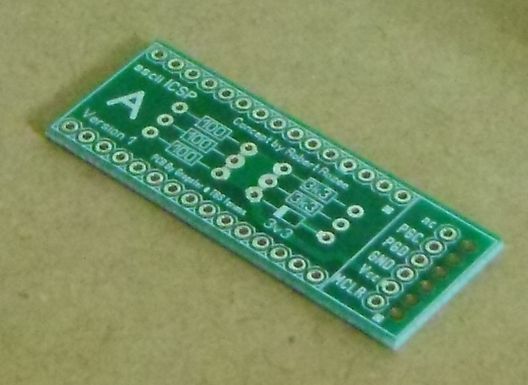 This is the blank PCB only for Robert Rozee's ASCII ICSP unit. You will need to supply the parts: 3x 100R resistors, 2x 3k3 resistors, and 1x 3v3 zener diode. This board(when assembled), mounts onto an Arduino Nano module, to form the complete programmer.